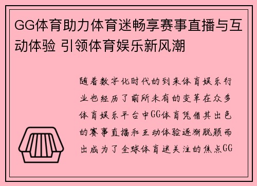 随着数字化时代的到来,体育娱乐行业也经历了前所未有的变革。在众多体育娱乐平台中,GG体育凭借其出色的赛事直播和互动体验,逐渐脱颖而出,成为了全球体育迷关注的焦点。GG体育不仅提供高质量的赛事直播内容,还通过创新的互动功能,打破了传统体育观赛的界限,重新定义了体育娱乐的体验方式。本文将从四个方面详细探讨GG体育如何助力体育迷畅享赛事直播与互动体验,领引体育娱乐的新风潮。首先,我们将探讨GG体育在赛事直播方面的优势,其次分析平台如何通过互动功能提升用户体验,再者,探讨其在个性化推荐和数据分析中的应用,最后,讨论GG体育如何通过社交媒体和社区互动构建体育娱乐的全新生态。通过这些方面的分析,我们将全面了解GG体育如何引领体育娱乐的新潮流,并为未来的体育娱乐发展提供有益的启示。