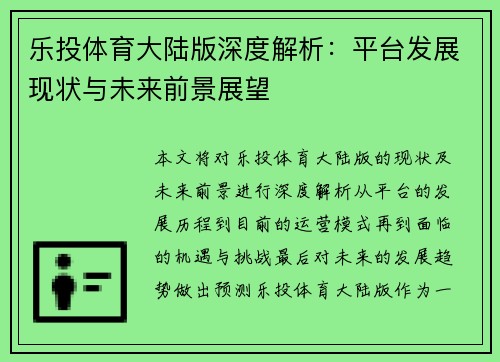 本文将对乐投体育大陆版的现状及未来前景进行深度解析。从平台的发展历程到目前的运营模式,再到面临的机遇与挑战,最后对未来的发展趋势做出预测。乐投体育大陆版作为一个线上体育博彩平台,近年来逐渐成为市场中的重要玩家。本文将从四个方面进行详细探讨,分别是平台的现状分析、技术创新与用户体验、政策环境及监管影响、以及平台的未来发展前景。通过对这些方面的分析,本文希望能够为读者提供全面的了解和深入的思考。